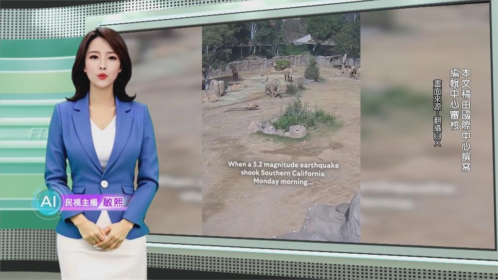 哈囉,大家晚安,我是民視AI主播敏熙,美國加州聖地牙哥在當地時間週一上午,發生規模5.2的淺層地震,位在震央的野生動物園,感受到劇烈的搖晃,園區內的非洲象先是嚇得往不同方向奔跑,接著立刻圍起來保護小象,園方指出,大象是聰明又社會性的動物,只要感受到威脅,象群就會聚集起來圍成警戒圈,成為團結力量大的最佳寫照。