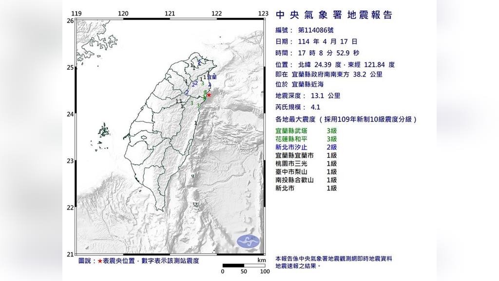 【原文出處】:6縣市有感!17:08宜蘭近海4.1地震 最大震度3級