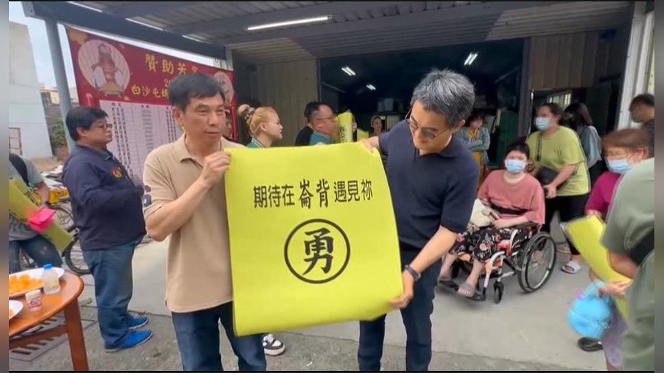 長長的人龍,從房子外一直排過去,過了轉角,繼續延伸出去!都為了捲起來的,這一個,從北到南,拂曉就來集合!民眾排隊領墊子,就深怕晚來一點拿不到喔!張開墊子來看看,一個大大的勇字,清楚辨識這是白沙屯媽祖的特定款,雲林崙背鄉民代表李居安,有感於白沙媽到北港進香,香燈腳隨香,沿途最不方便是休息、睡覺,與朋友集資做瑜珈睡墊,每年還改良!