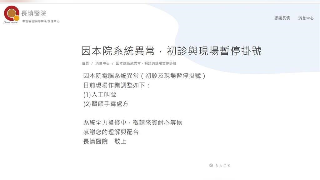 醫院官網緊急公告,由於本院系統異常,暫停初診與現場掛號,改用人工叫號與醫師手寫處方因應。