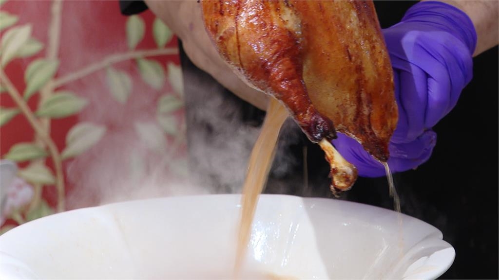 剛出爐的燒鵝,淋上點燃的白蘭地,火焰立刻包覆燒鵝,讓濃郁酒香轉為淡淡甜味。打開底下封口,滿滿高湯彷彿瀑布,不停往下流,難怪取名叫瀨尿鵝。大刀一切,鵝皮酥脆、鵝肉吸收高湯更濕潤,師傅在鵝肚子裡,抹上鴨鹽、高粱酒,還有甜麵醬,去除腥味提出香氣,接著八角等中藥打底,熬了兩天的高湯,全都灌進肚子裡,準備封口。榮譽主廚何炳木:「明朝宮廷家宴出來的,塞了我們基底的醬料,還有塞我們的高湯進入,讓湯汁融入燒鵝裡面。」