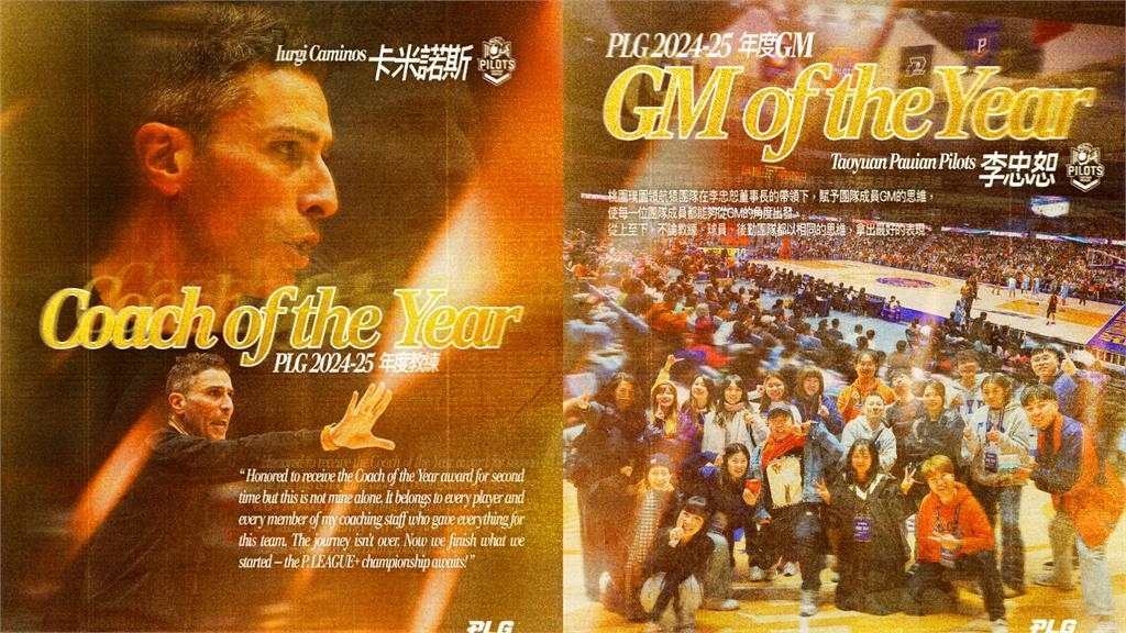 P. LEAGUE+今日(04/23)公佈2024-25球季年度教練、年度GM及年度主場,桃園璞園領航猿總教練卡米諾斯本季再度率隊拿下例行賽第1名,成功蟬連年度教練。年度GM的部分,領航猿的李忠恕成功打造領航猿成為PLG常勝軍,獲得記者及各隊GM推崇得獎。年度主場則由臺北富邦勇士首度獲得。
