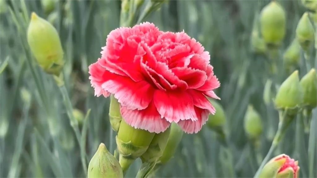 康乃馨陸續綻放,隨風搖曳,紅色的花瓣在一片綠葉叢中,格外顯眼,只是放眼望去,原本應該盛開,卻只有寥寥幾朵,大部分都是綠色花苞,讓花農的臉都要綠了,採花採了一個早上,只採了一點點。
