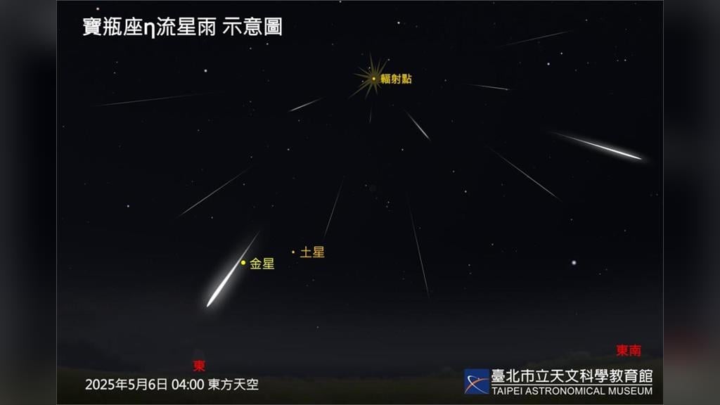 北市天文館也建議民眾,可在午夜後,於視野開闊且遠離光害的環境觀賞寶瓶座η流星雨,日出前或許還可在東方天空捕捉到流星與金星、土星共舞的美景。相關資訊請參閱台北天文館網站「天象預報」。