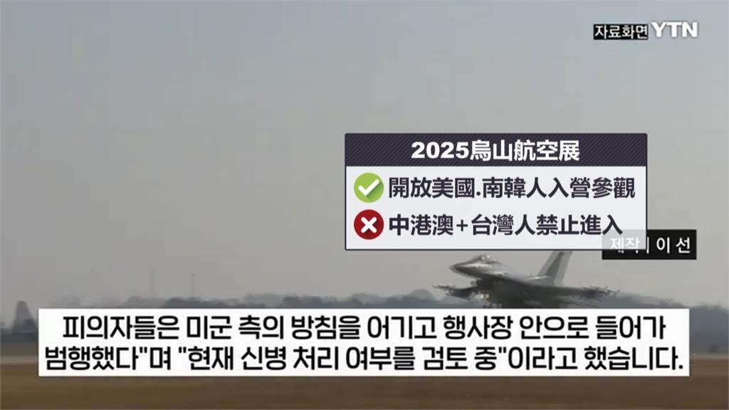 韓媒指出,一名60多歲的台灣籍A男和另一名40多歲的台灣籍B男,5月10號上午,先是A男三度被美軍阻止進入,接著兩人竟然偷偷混入韓國人群中,潛入營區拍攝戰機飛行表演和軍事基地等設施,目擊者通報,現場有可疑人士,隨後兩人遭到警方逮捕,隔天依違反"軍事基地暨軍事設施保護法"扣押,進行審問。軍事專家施孝瑋:「這種(航空展)尤其是軍事裝備的東西,每一個參展或是說開展,它都基本上會有一些,或多或少針對區域等等這樣的限制,韓國對於這種機場外拍攝的人,一般民眾對於這些人的警覺性是比較高一點。」專家分析,航空展涉及韓美空軍的機敏設施,因此設限較多。根據了解,兩人是持著觀光簽證入境,儘管雙方聲稱互不認識,但警方仍研擬是否聲請羈押令。
