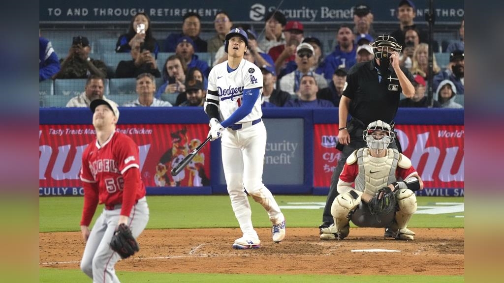 8局下半一人出局無人在壘,大谷翔平逮中一顆89.6英里(約144.2公里)的卡特球,一棒轟出中外野大牆,這發擊球初速高達114.9英里(約184.9公里)、飛行距離416英尺(約126.8公尺)的大號陽春砲幫助道奇追回1分,目前比賽進行到9局上半,道奇2:6暫時落後天使4分。
