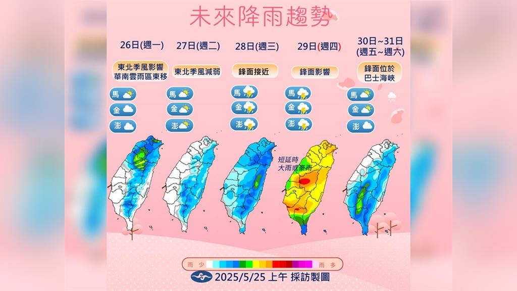即時中心/顏一軒報導5月30日至6月1日民眾將迎來連續3天的端午節假期,不少民眾有規畫返鄉及出遊的安排,不過恐怕會受到鋒面影響。中央氣象署今(25)日上午說明,今、明(26)日受東北季風與華南雲雨區東移影響,各地處於偏濕冷的天氣型態,沿海要注意較大風浪,28日起比此波範圍更廣的鋒面將接近,直至30、31日雨區會移到南台灣附近;而溫度方面,至於未來一週大致上都不會非常炎熱,提醒民眾外出適時添加衣物。