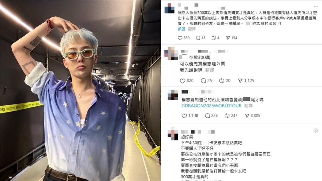 眼看搶不到票,許多網友也紛紛表達對於售票機制的不滿,根據《今日新聞Nownews》報導,Threads上有許多小道消息,稱只要是銀行的VVIP,就能在12:30搶票,甚至有網友稱提供300萬的財力證明就能取票或購票,不過網路上種種傳言都尚未經過官方證實,但已經讓網友們炒成一片,眼看陰謀論瘋傳,甚至有網友開酸「凱基存款300萬,可以優先買權志龍的票,我先謝謝喔」、「權志龍知道他的台北演唱會變成銀行尾牙嗎」、「志龍有夠可憐,睽違8年回歸,結果來唱尾牙」。