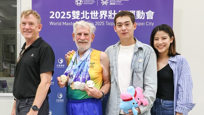 藝點新聞Jeffrey編輯整理「2025雙北世界壯年運動會」本屆吸引超過2.5萬名國內外選手報名,總參賽人次高達4.8萬,是臺灣史上最大規模國際體育盛事之一。來自世界各地選手在場上全力拚搏,並對臺灣熱情友善氛圍與多元旅遊體驗表達高度肯定與期待;昆凌爺爺Laurence Quinlivan完成所有賽事後分享:「感謝主辦單位,這次活動對我非常有意義。不只是比賽,而是能與世界各地志同道合的朋友們共同享受運動、分享健康生活的價值。」昆凌爺爺Laurence Quinlivan(左2)。(圖/大會提供)Laurence Quinlivan這次在世壯運喜收3金2銀,除了競賽外,他也提及與泰國105歲薩旺(Sawang Janpram)、紐西蘭99歲馬丁(Allan Martin)成為好友,「雖然語言不通,但我們透過運動彼此理解與尊重,這就是體育的魅力。」世壯運是30歲以上運動愛好者的國際賽事舞臺,為讓國內外選手在比賽之餘深入體驗周邊在地文化與自然風光,賽會推出32條自由行遊程外,也串聯各式店家提供多樣優惠,全方位展現臺北的城市魅力,不僅彰顯舉辦國際賽事實力,也讓世界看見臺北的活力與友善形象。像是來自新加坡的壁球選手Charles對臺灣人文風情充滿期待,他說:「我正在臺北參加(世壯運)壁球比賽,接下來計畫利用剩餘時間騎自由車環島。臺灣的每個人都非常友善,謝謝你們!」澳洲曲棍球選手Karen首次參加世壯運,興奮之餘也笑稱:「有點擔心這裡天氣會有多熱,但非常期待度過一段精彩時光!」瑞士排球好手Christen Broennimann則說:「我從12歲就開始打排球,這次參加室內與沙灘排球項目,我們非常期待參與這些精彩比賽!」而德國柔道選手Jessica Lindner與兒子一同參賽,她說:「我和兒子一起來,我是柔道選手,我希望可以打得不錯,預祝賽會成功,並能結交來自世界各地的朋友!」來自南非、現居臺灣的田徑選手Johannes Blignaut幽默表示,參賽是為了「想再瘦一點、再多做一些運動」,所以選擇參加田徑35歲以上組的鐵餅與鉛球項目,展現世壯運鼓勵全民運動的宗旨。此外,第三次參加世壯運的澳洲壁球選手提到,自己透過密集訓練與教練指導備戰,對賽事充滿信心;來自日本的坂 敏之(Toshiyuki Saka)選手也分享,自己非常喜歡臺灣、已經來了百次以上,這次是參加世壯運游泳項目,獲得一金、四銀、一銅牌,會待一星期。延伸閱讀奪世壯運拉丁舞銀牌 女星高欣欣:不要找藉口、做就對了! 工程師搭Uber意外中圈套! 醒來時「畢生積蓄幾乎要沒了」