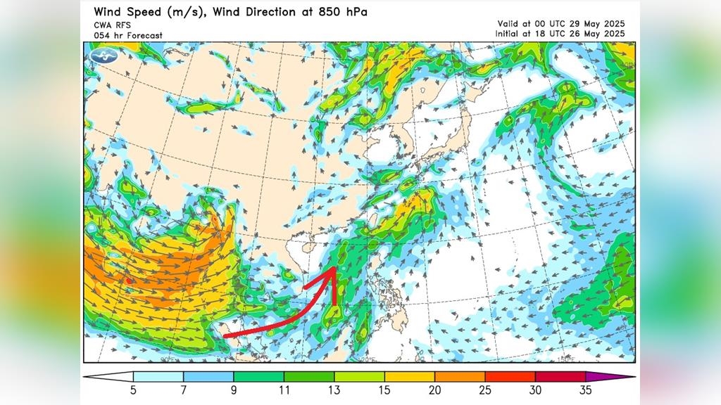 「西南季風入南海」,鄭明典說,時間點算很明確了,28至29日之間,西南季風在南海建立起來!