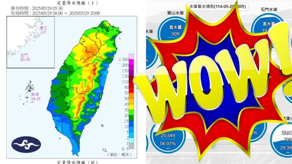 根據中央氣象署,今(29)日鋒面通過,台灣各地有大雨、西半部地區有局部豪雨發生的機率,晚起北部及東北部地區轉為有局部短暫陣雨。而根據農田水利署嘉南管理處規劃,一期稻作的供水持續到6月上旬,目前已經進入尾聲,但未來將視降雨狀況滾動調整,節省水資源;南水分署也曝光了曾文水庫及烏山頭水庫目前的蓄水量及水情。