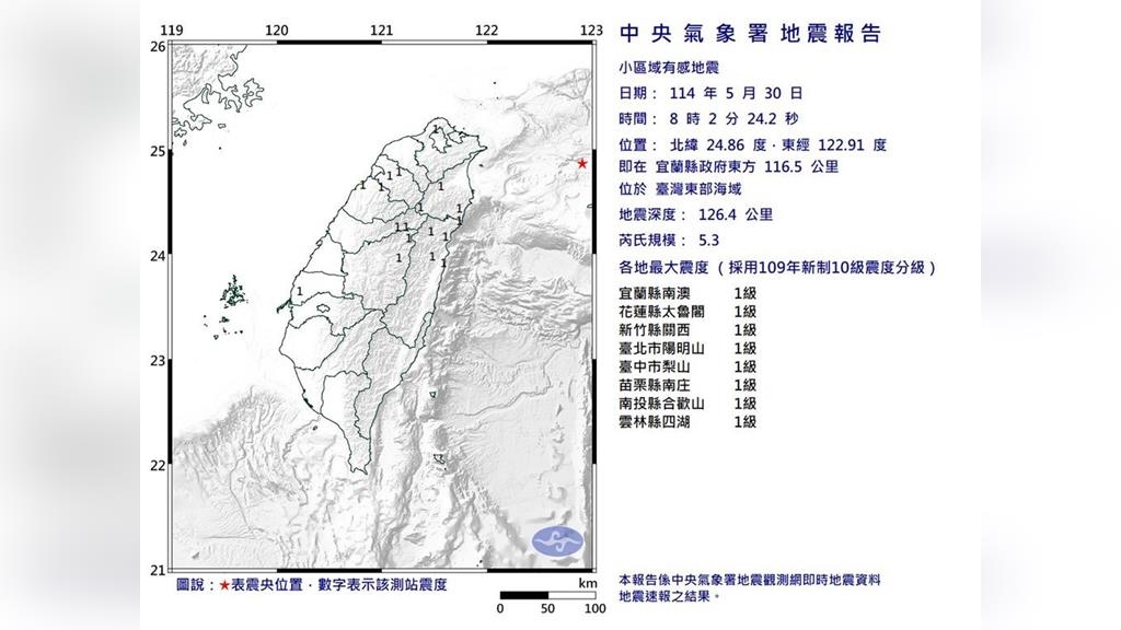 氣象署表示,今日上午8時2分在台灣東部海域發生芮氏規模5.3有感地震,震央位於宜蘭縣政府東方 116.5 公里,地震深度126.4公里,屬中層地震。