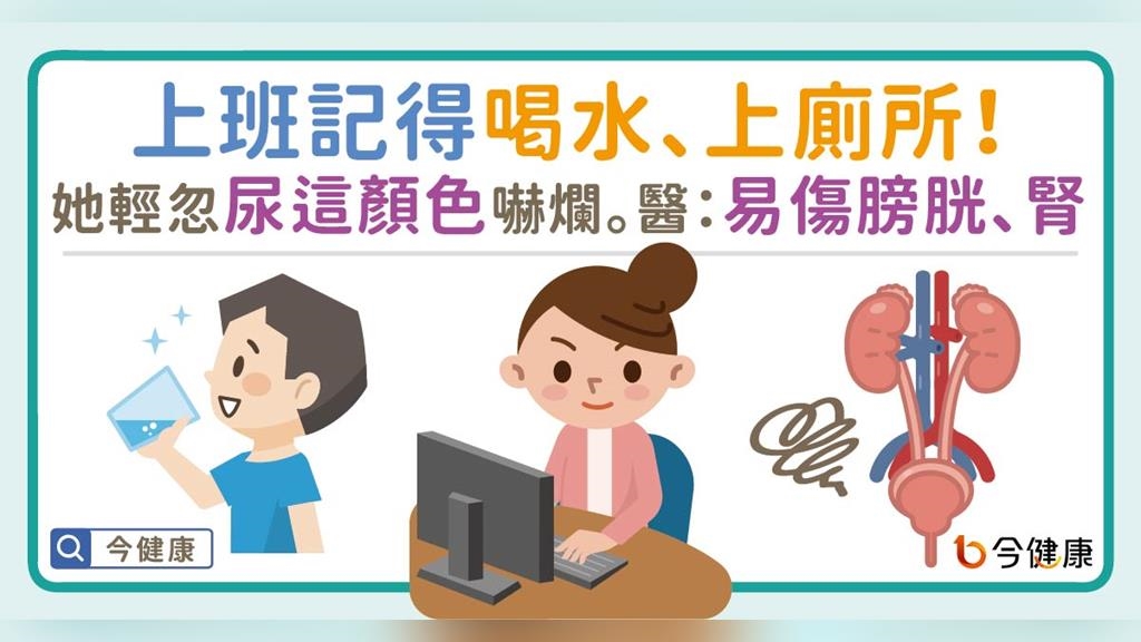 提醒民眾,上班再忙也要想辦法喝水、上廁所。尤其工作是常態性生活的一環,並非偶爾,若經常憋尿、不喝水,長期下來恐怕傷害膀胱和腎臟。
