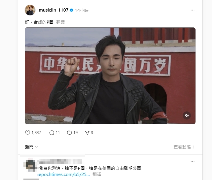 不過就有網友懷疑畫面有造假,對此,八炯無奈回應「好,合成的P圖」,並曬出影片,畫面中八炯站在天安門微縮景觀,因為風太大還順手喬好頭髮,也證明畫面不是透過合成P圖,是現身在美國洛杉磯的天安門紀念碑旁的微縮景觀。相關畫面曝光後,就有網友留言,「然後說這是AI影片」、「這洛杉磯的反共自由雕塑公園拍」。