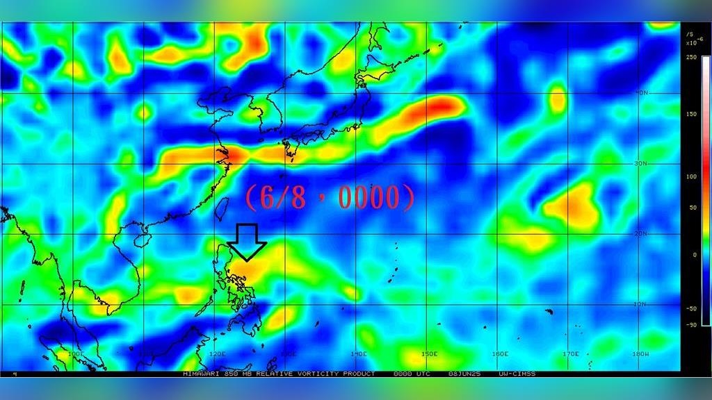 根據最新分析,目前季風槽內出現一個較為集中的正渦度區,但其位置接近陸地,發展空間受限,風場資料比對顯示,此正渦度主要來自北側強風推動,整體環流尚未成形,RAMMB(區域與中尺度氣象研究中心)資料亦指出,其中心並未伴隨明顯對流現象。儘管如此,由於該正渦度區南側仍有季風氣流支撐,其系統不易快速消散,未來仍具有一定發展潛力。