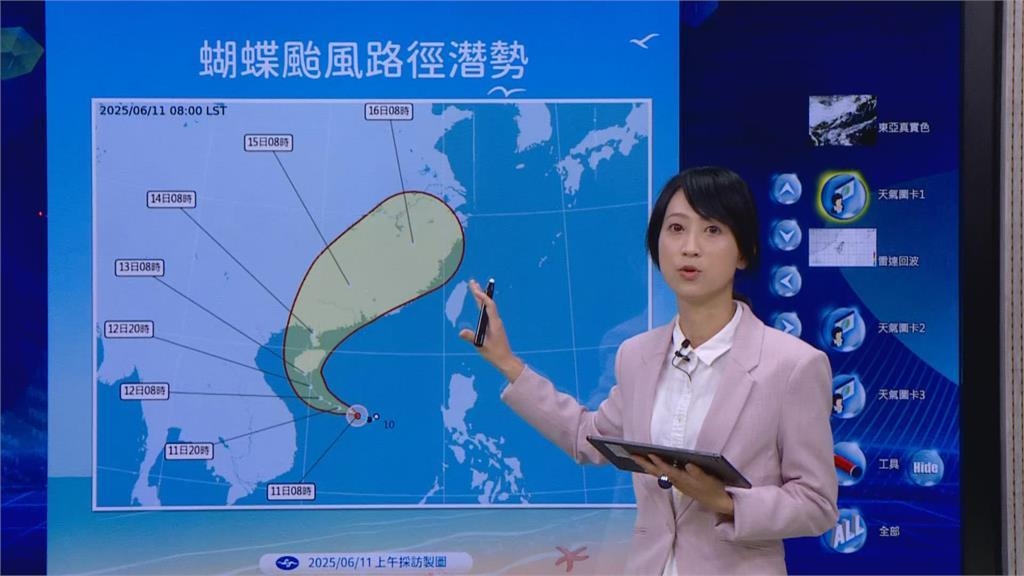 今(2025)年第一號颱風「蝴蝶」於今(11)日上午8時生成,預估將朝西北西方向,持續往海南島前進,對台灣無直接影響。中央氣象署稍早說明,未來兩天低壓區的水氣會漸漸往台灣東半部接近,今日下半天開始東半部降雨會逐漸增加,從明(12)日起至週末天氣都不太穩定;而儘管「蝴蝶」有朝東北轉向的趨勢,但距離台灣仍有一段距離。