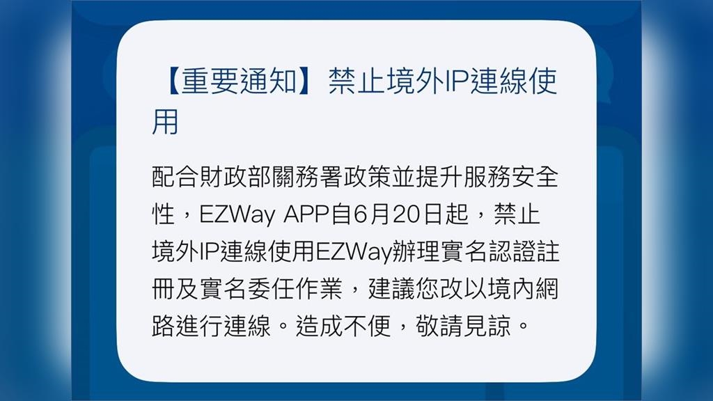 這是EZ WAY易利委實名認證App推出5年多以來,首度公告不支援海外IP申請認證。財政部官員指出,關務署之所以推出這項新制,目的是防止境外IP冒名連線,不讓爭議IP從海外報關,以降低交易糾紛。