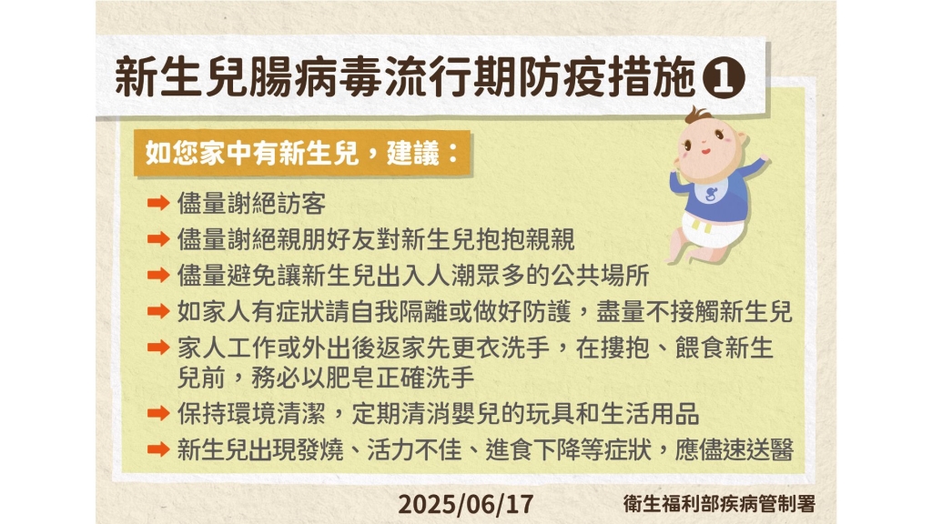 疾管署已於官網成立「新生兒腸病毒防疫專區」提供孕產婦和家中有新生兒的注意事項、衛教資源、感染管制指引、常見問答等,供民眾查詢。疾管署再度呼籲以下新生兒腸病毒流行期間防疫措施: