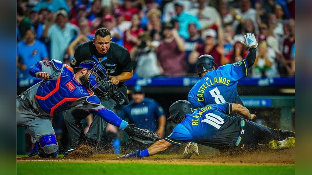 費城人大都會之戰,7局下滿壘局面,費城人二壘手斯托特(Bryson Stott)敲出左外野二壘安打,一棒清壘,不過壘上跑者疑似不確定球的落點,等到球打到牆上才啟動衝回本壘,形成兩名跑者一起滑回本壘的罕見場景。