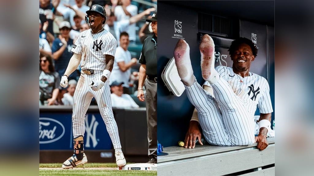 洋基今天出現了「無鞋爵士」(Shoeless Jazz)!三壘手小奇森姆(Jazz Chisholm Jr.)從三壘衝向本壘時,因為襪子太溼讓他的釘鞋在奔跑中滑脫,但他還是順利滑回本壘得分,沒有鞋子還能跑這麼快得到分數,讓現場球迷驚呼連連。