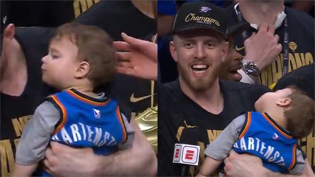 雷霆在總冠軍賽第七戰擊敗溜馬,拿下隊史首冠,在主場捧起歐布萊恩金盃,讓球迷陷入沸騰。然而賽後封王儀式上,先發中鋒哈爾特斯泰(Isaiah Hartenstein)兒子卻已經陷入「斷電」狀態,完全不受現場鼓譟聲影響,深深進入夢鄉。