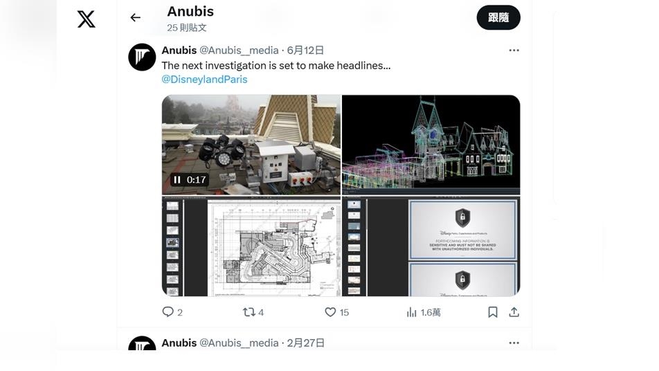 該集團同時在社群平台X釋出一段約20秒影片,內容為巴黎迪士尼園區內不對外開放的大樓屋頂場堪(scouting)畫面,進一步揭露園區設施佈局與安全管理細節,還特別提供重點項目「冰雪奇緣」的完整研究報告,這份PDF檔共計395頁,內容涵蓋總體設計圖、更細部的區域規劃以及電力與供水系統的配置計畫。Anubis強調:「這是迪士尼樂園歷史上最大規模的資料外洩事件!」