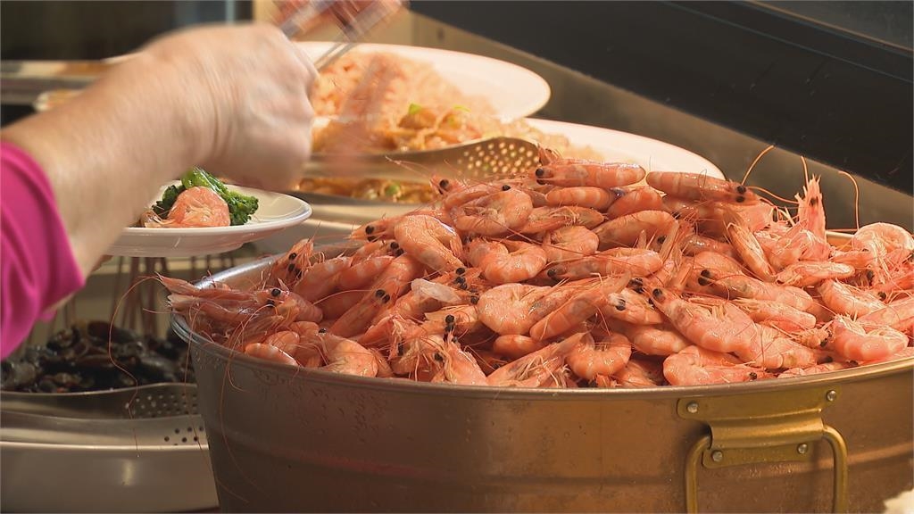 民眾開心進場,準備要大吃特吃,無論是炸物、熱炒菜、整桶鮮蝦、將近20道水果,還有甜點琳瑯滿目,上百道自助沙拉吧,甚至連披薩都有。