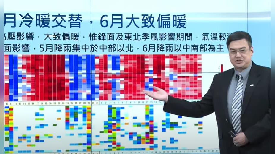 降雨部分,陳怡良則說道,受鋒面及東北季風影響較大的時間,例如5月上旬及下旬,全台還是有不少降雨;但降雨量主要集中於中部以北。至於5月中旬,也就是溫度偏暖的這段時間,主要受太平洋高壓籩罩影響,降雨主要來自午後雷陣雨。而6月上旬,月初曾出現一道鋒面,因此也有帶來蠻顯著的降雨;至於上旬的末段,則是出現熱帶性低氣壓、以及伴隨西南風影響,造成全台顯著降雨。