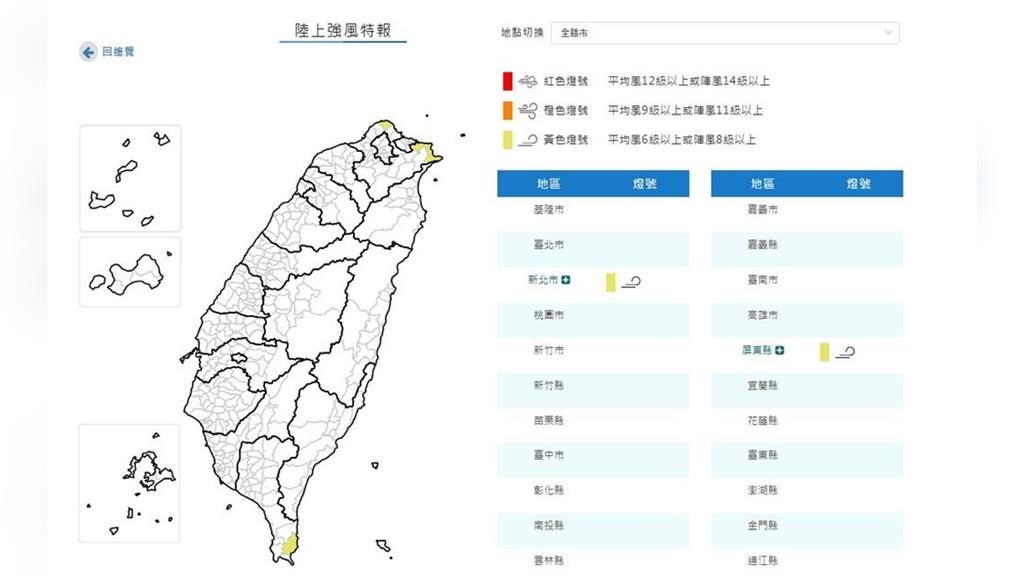 氣象署指出,今日上午至明日晚上,在新北市石門區、瑞芳區、貢寮區,以及屏東縣滿州鄉,有平均風6級以上或陣風8級以上發生的機率,達到強風黃色燈號。