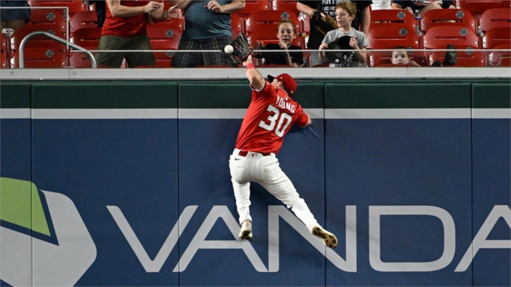 大聯盟今天(3日)又出現「外野蜘蛛人」,國民在主場與老虎進行雙重賽,第二戰打到九局上半,暫時領先的地主國民一顆外角速球被對手逮中,深遠飛球直闖中外野高牆,國民中外野手楊恩(Jacob Young)迅速向後退、一個墊步踩在全壘打牆上「原地起飛」,精彩沒收準開轟球,「華盛頓航空」美技守備博得全場掌聲。