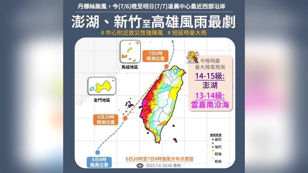 劉宇其說,丹娜絲颱風中心預計在今深夜前後通過澎湖,並從中部地區登陸,而今晚至明天上午是颱風風雨最大的時期,雨區以西半部地區、澎湖為主,多數地區有局部大雨或豪雨,高屏山區累積雨量可達大豪雨等級。