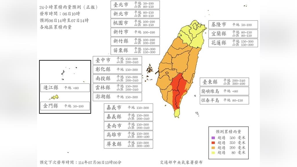 苗栗縣山區、台中市山區、南投縣山區、雲林縣山區、嘉義山區、台南市山區、高雄市山區、屏東縣山區、台東縣山區、花蓮縣山區。10縣市達山區累積雨量預測200毫米以上,符合停班停課標準。