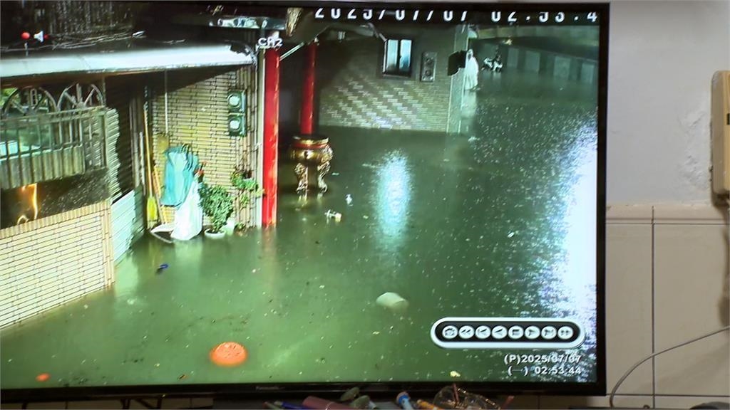 民眾拍下畫面,深夜三點,外頭下著大雨,堤防外寶珠溝水位高漲,湍急水流直往下游,但堤防內,住家前的巷子,也變成小河,水淹到機車的半個輪胎高,從民宅監視器來看,居民出門查看涉水而過,水位快到膝蓋這麼高。