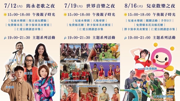 藝點新聞Jeffrey編輯整理仲夏夜之夢為永和區的年度盛會,今年已邁入第29年,將在7月12日、7月19日、8月16日及8月30日的星期六,於仁愛公園熱鬧登場!從下午3點到6點打造大型水樂園的親子時光,到晚上7點到9點半的主題系列活動,包含《雋永老歌之夜》、《世界音樂之夜》、《兒童歡樂之夜》和《經典民歌之夜》,讓市民一路從下午玩到晚上,不僅是一場匯聚音樂與歡笑的盛會,更是專為您和家人打造的幸福夏夜。(圖/新北市政府)本次活動首場由《雋永老歌之夜》在7月12日揭開序幕,重磅卡司有華麗女伶李翊君、金曲王子許富凱、華語天后許景淳、七海刀狼沈文程、情歌詩人于冠華等實力派歌手輪番演出,帶領大家回味一首首百聽不厭的雋永老歌。接著,7月19日是本次新增的特色藝文演出《世界音樂之夜》,利用不同國家的樂器及舞蹈,帶您到仁愛公園周遊列國,來自非洲、土耳其、英國、西班牙、夏威夷、泰國,以及熱情的拉丁美洲,震撼人心的戰鼓秀、節奏強烈的東貝鼓、踢踏舞,還有充滿張力的鬥牛舞等多元文化的精彩表演,為您呈現一場層次豐富、多種文化交織的跨國藝術盛宴。而第三場8月16日《兒童歡樂之夜》是為小朋友量身打造的藝文演出!除了邀請到孩子們的最愛MOMO家族帶動跳之外,另安排新北市傑出演藝團隊-天馬戲創作劇團,帶來有教育性、環保認知的華麗兒童劇,劇碼為《蟲蟲探險家》,保證讓小朋友們看得目不轉睛,笑聲不斷。最後壓軸場8月30日是眾所矚目的《經典民歌之夜》,每年仲夏夜的民歌之夜幾乎是指標性的演出。最精彩的民歌演出就在永和仲夏夜之夢!今年邀請到民歌教父施孝榮、三金歌王殷正洋、最強組合南方二重唱、不老情人于台煙、金韻歌王李明德,用歌聲陪伴市民走入民歌的黃金年代,達到活動高潮,嗨翻永和仁愛公園。除了夜晚的精彩演出,歡樂多元的《午後親子時光》更是為永和的暑假散播孩子們無盡的歡笑聲,每個活動日下午3點到6點,今年主辦單位以「兒童水樂園」為主軸,精心準備超過24公尺的組合滑水道氣墊、手作DIY、復古童玩,歡迎小朋友來玩水消暑一夏,現場更有加碼提供免費限量的爆米花或棉花糖,讓大人小孩都能找到屬於自己的快樂天地。為方便來參加活動的民眾解決吃的問題,區公所更在仁愛公園規劃了創意市集,邀請優質攤商及可愛的胖卡餐車在仁愛路人行道和飆舞廣場進駐,讓民眾玩累了、渴了都可以就近享受美食。永和區長周慶珍表示,29年來,《永和仲夏夜之夢》陪伴著無數家庭成長,每年都有不同的驚喜與感動。今年為擴大活動參與,感謝中永和在地企業共同贊助「集章抽好禮」的摸彩品,只要參加其中任兩場並完成宣傳摺頁背面的集章,就能在最後一場8月30日經典民歌之夜兌換摸彩券,豐富獎項包括Gogoro電動機車、電競電腦、蘋果16 Pro Max最新型手機、三星7.6吋折疊手機、腳踏車、萬元現金及優質禮券等多份好禮,獎項總金額超過30萬元!歡迎大家來永和享受美好的音樂饗宴,還可以試手氣中大獎。周慶珍也特別感謝町洋企業在8月8日父親節當天,加碼贊助一場紙風車劇團《台灣幻想曲》,在永和仁愛公園中央大草坪演出,將國家戲劇院規格的演出帶到現場,饗宴大小朋友,讓永和仲夏系列活動更豐富更精彩!永和區公所提醒,活動期間人潮眾多,建議民眾多利用大眾運輸工具前往,共同打造舒適順暢的活動空間。