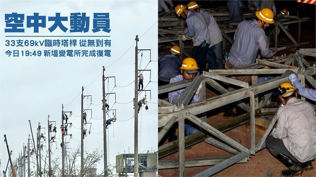 「台電電力粉絲團」昨發出的貼文中可見搶救新塭變電所時架設的臨時桿塔上,全部站滿了工人,不畏風雨努力工作的模樣讓網友看了表示:「謝謝辛苦的台電英雄們!」、「每一支電桿上都有人」、「這畫面真的讓人感動」、「謝謝辛苦的台電英雄們」、「非常感謝台電所有的員工,再多的言語都表達不了心中的感謝」、「謝謝你們辛苦了一定要注意安全」、「我家今晚復電了,非常感謝,您們辛苦了」。