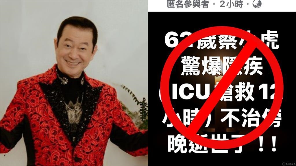 蔡小虎14日透過臉書粉專發文,曬出自己拍攝實境節目時的模樣,但在眾多歡樂照中,卻出現一張文章截圖,只見該圖為某粉專貼文,寫下「62歲蔡小虎驚爆隱疾(ICU搶救12小時)不治傍晚逝世了!!」,讓他氣得直喊「不實報導」,並在文章寫下「小虎『底加』啦!麥黑白貢(不要亂說)」。