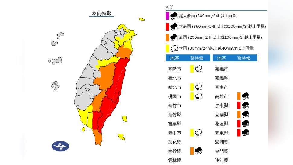 大雨特報地區包括:基隆市、新北市、桃園市、台中市、台東綠島、台東蘭嶼,及宜蘭縣、高雄市、屏東縣平地。