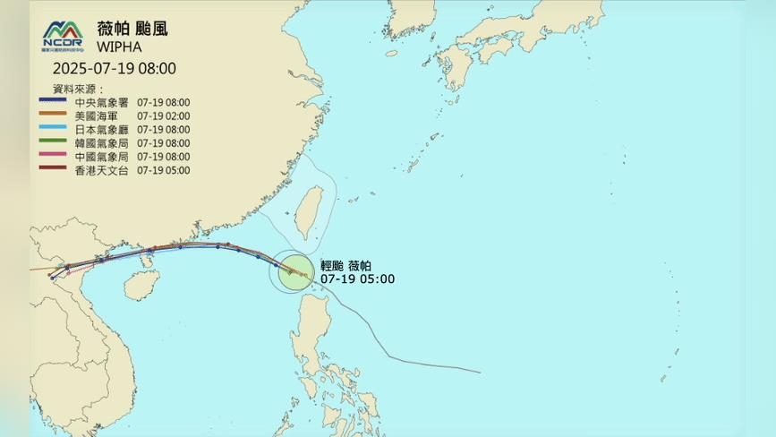 輕颱「薇帕」今(19日)晨最接近台灣近海,8點中心位置在鵝鑾鼻的南南西方約240公里處,以每小時24公里速度,向西北西轉西進行。目前暴風圈正逐漸通過台灣南方近海,對巴士海峽、台灣海峽及東沙島海面構成威脅,預計此颱風強度仍有稍增強且暴風圈有稍擴大的趨勢。