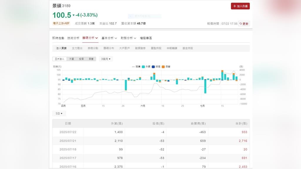不過市場對於ABF載板需求有增無減,各界看好下半年景碩的獲利成長動能,內外資法人近日皆擴大幅度加碼買超佈局,儘管今天盤面漲幅前三大類股依序為生技、電線電纜及塑膠;而PCB族群股中受高階載板原料短缺,原料價格上調,為反映ABF載板成本,包括景碩(3189)、欣興(3037)及南電(8046)已蘊釀調高載板報價,市場看好後續獲利成長動能,更讓外資更連9日買超景碩,下跌究竟是該買還是該賣?網友看法兩極。
