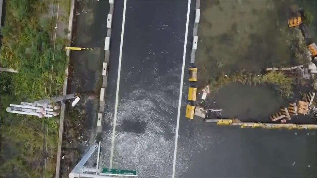 透過空拍畫面來看,台南七股堤防破損嚴重,好幾處空洞,都先以黃黑色消波塊阻擋因應,但這麼做還是抵達不了大量海水倒灌湧入村落,立委郭國文和林俊憲等人,到場進行會勘,只見大量海水已經淹沒周邊鹽田,更覆蓋整條馬路。台南市七股鹽埕里長謝勝江:「我們現在大漲潮,還不知道要幾天,現在都滿水位的狀態,廢棄鹽田都滿水位,整個村莊的人都惶心恐恐。」