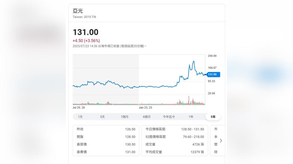 1.亞光(3019)收盤價131元 漲4.5元