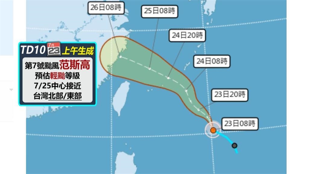 氣象署技正林秉煜:「在菲律賓東方海面的熱帶性低氣壓,已經在今天早上8點已經形成第7號颱風范斯高。」原本的TD10週三上午生成,路徑比原本預估再往北一些,可能落在輕颱等級,7月25日颱風中心會最接近台灣北部及東部,不過氣象署也說,25日到26日之間,范斯高很可能就會減弱成熱帶性低氣壓。氣象署技正林秉煜:「我們預估這個范斯高颱風它未來會稍微增強,但幅度、空間並不高,持續向西北方向移動,到時候受到颱風外圍雲系的影響,它會帶來比較偏北到東北風的情形,因此在7月24日下半天到7月25日這段時間,北部地區下雨的情況相對來說會比較明顯。」