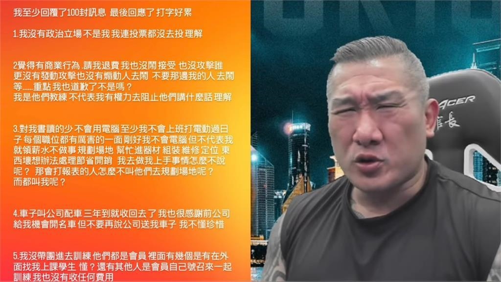 針對館長稱送車給大胖,他表示該輛車為「公司配車」且3年就收回去了,「我也感謝前公司給我機會開名車,但不要再說公司送我車子了我不懂珍惜。」他強調,自己沒有帶團進去訓練,他們都是會員且有幾個是在外面上課找他的學生,至於其他人則是會員自己號召來一起訓練,沒有收取任何費用。文末,大胖更忍不住嗆館長:「叫我直播面對,我跟你說,如果我今天出來直播反擊才叫背骨,公開審判11年員工,我再次承受了。」