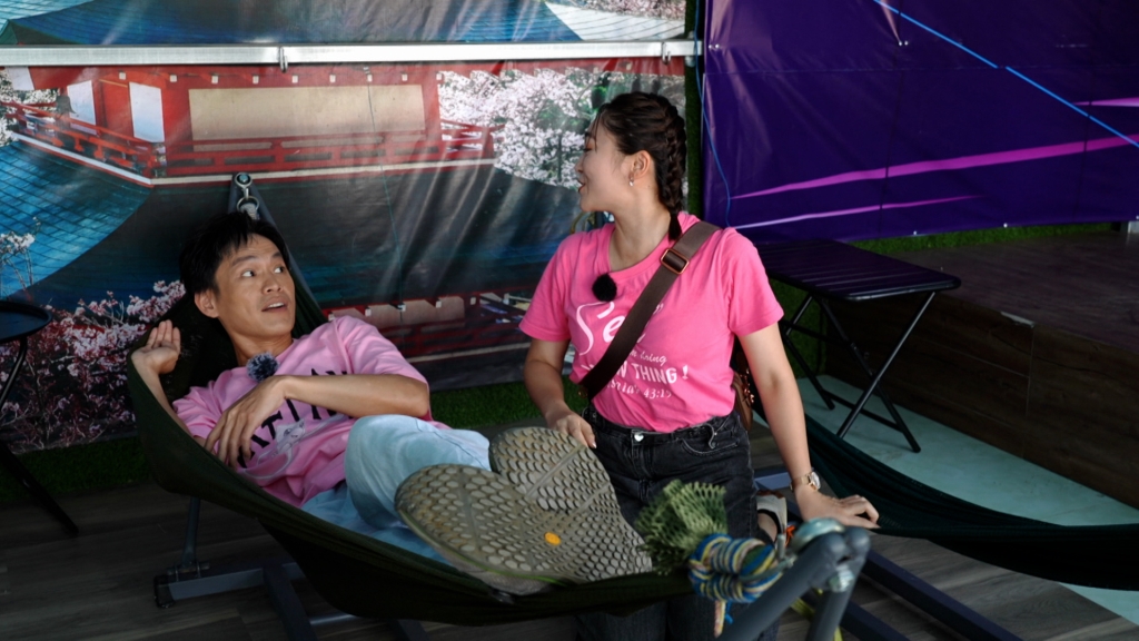 詹姆士、黃鐙輝在最新一集《行!鬥陣出國去!》與嘉賓張文綺、陳怡婷、台語顧問陳豐惠前往越南同奈,由在當地販售台灣小吃地瓜球、同時也是YouTuber的強尼帶領下,探索越南的秘境,眾人前往吊床咖啡廳「躺著喝咖啡」,鬼靈精怪的張文綺突然一時興起的想爬上黃鐙輝的吊床,試看看有沒有辦法2人擠在一張吊床。太過突然的舉動嚇到黃鐙輝,他緊張的護著自己身體,「這樣怎麼喝咖啡啦?很不優雅!」。