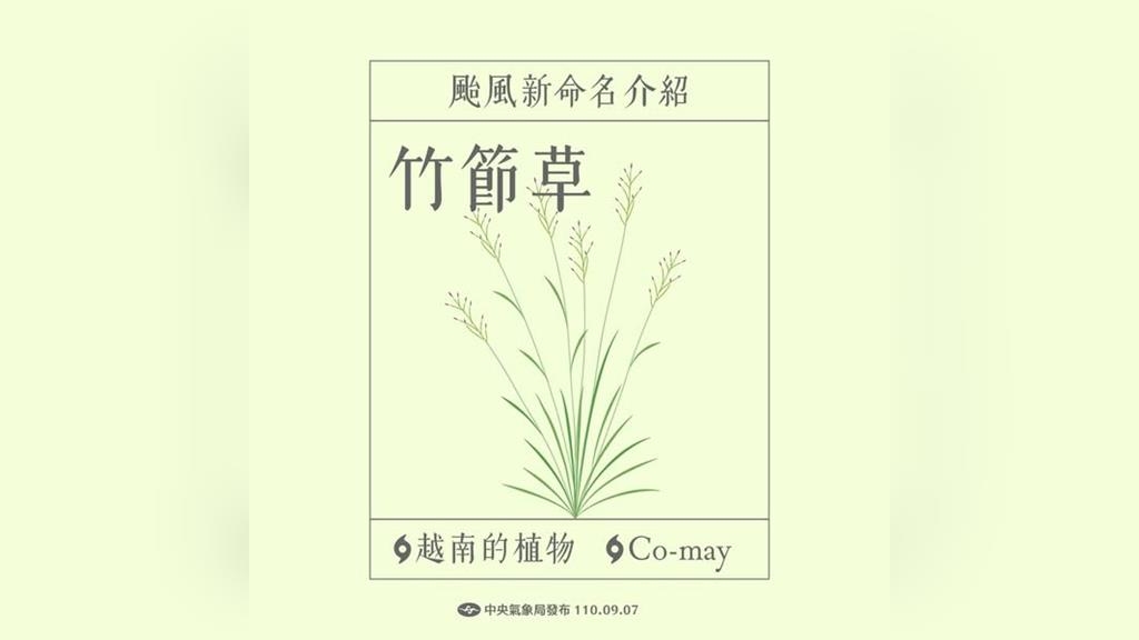 「報天氣-中央氣象署」說明,西北太平洋颱風的名字,是由鄰近的14個國家或地區所提供,組成一張140個名字的清單總表,然後依序輪流使用,當有颱風造成巨大傷亡或損失時則會被「除名」再由新的名稱遞補,而「竹節草」颱風是2021年新遞補的名稱,取代了2019年造成嚴重災害而被除名的「利奇馬」颱風。