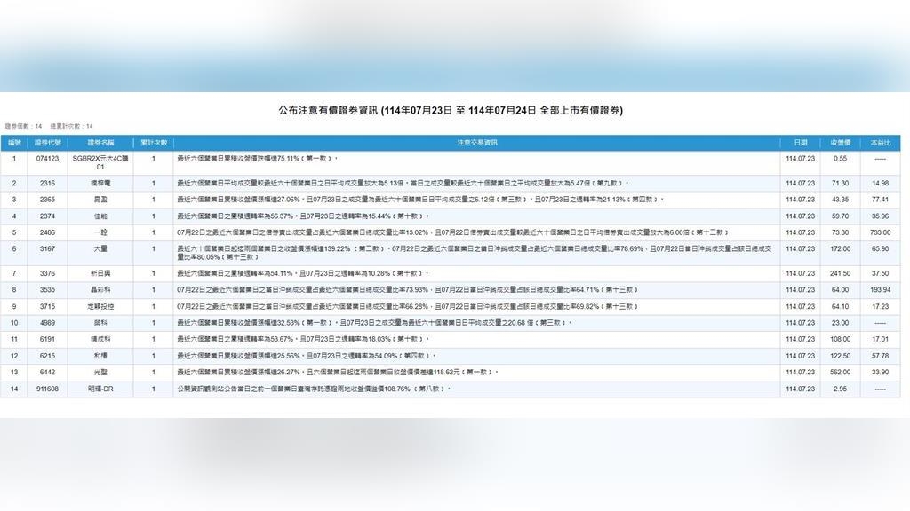 證交所公告14檔注意股 這家設備廠4月至今漲快3倍