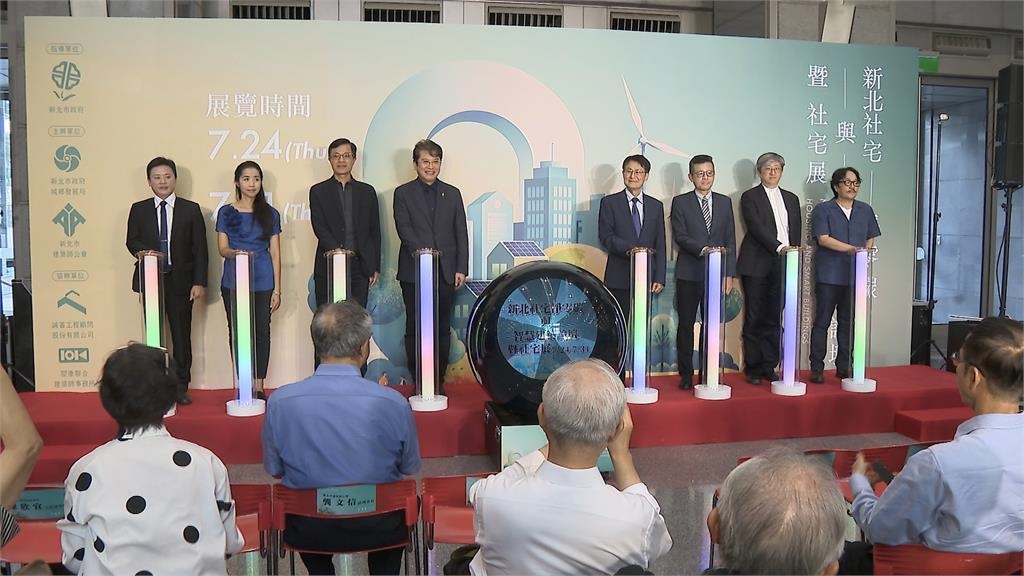 手按燈柱,為展覽揭開序幕,新北市舉辦"社宅淨零碳與智慧建築論壇暨社宅展",展示近期推動社宅的成果。新北市目前已興辦3.6萬戶社宅,長期要擴充到4.5萬戶,不只要落實居住正義,更以永續發展為目標。