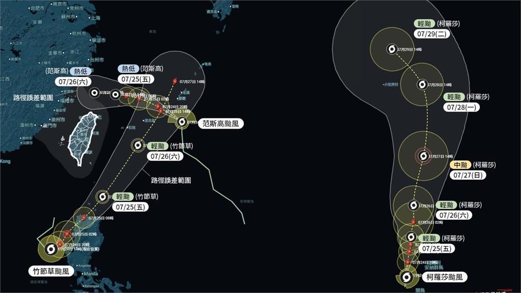 今年第7號颱風「范斯高」與第8號颱風「竹節草」在23日先後生成,形成「雙颱共舞」的罕見天氣型態,如今更有第9號颱風「柯羅莎」加入,瞬間成了「三颱共舞」,不禁讓人好奇「是否會放颱風假?」對此,氣象粉專《台灣颱風論壇|天氣特急》特別揭露了放假的機率,點名3地區注意雨彈。