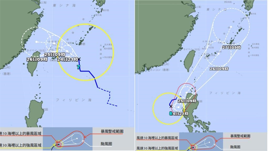 生活中心/張予柔報導今年第7號颱風「范斯高」與第8號颱風「竹節草」在23日先後生成,形成「雙颱共舞」的罕見天氣型態。根據日本氣象廳預測,兩颱接下來兩天將相繼靠近台灣周邊海域,雖不會直接登陸,但外圍環流恐為全台帶來明顯降雨與強風,氣象單位提醒各地需嚴防豪雨及劇烈天氣。