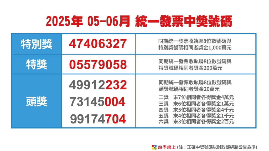 2025年05、06月統一發票開獎號碼如下: